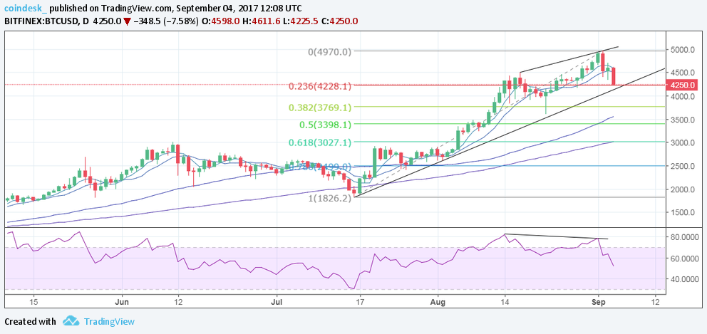 • The bearish price RSI divergence suggests a short-term top in place around $5,000, although only an end-of-day close below $4,133 today would abort the bullish view and signal potential for more losses towards $3,769 (38.2 percent Fibonacci retracement).