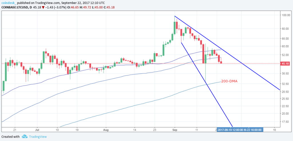 The litecoin-U.S. dollar (LTC/USD) exchange rate is again trading below $50, just three weeks after setting a new all-time high just below $100.