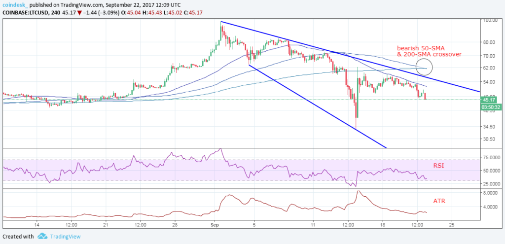 • Litecoin is likely to test 200-SMA support of $33.52 in the short-run.